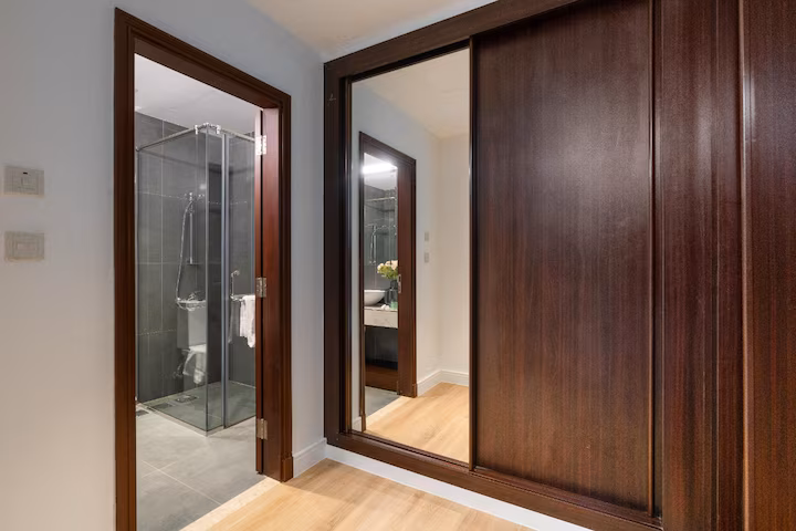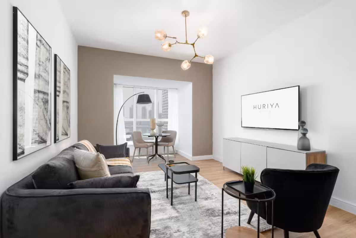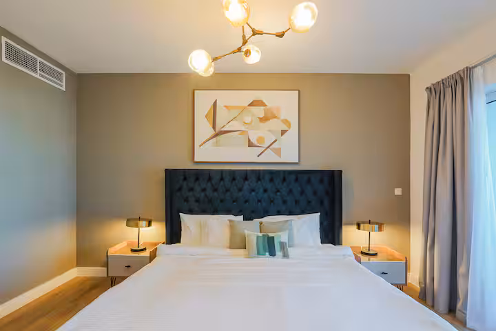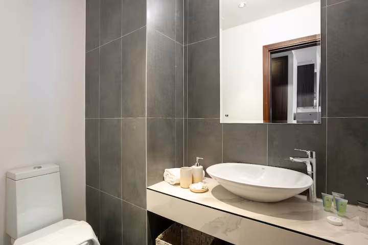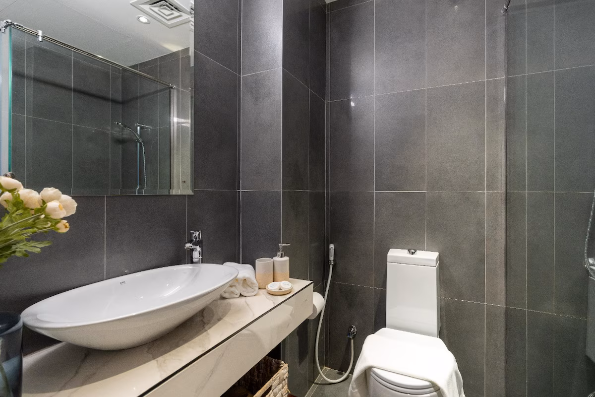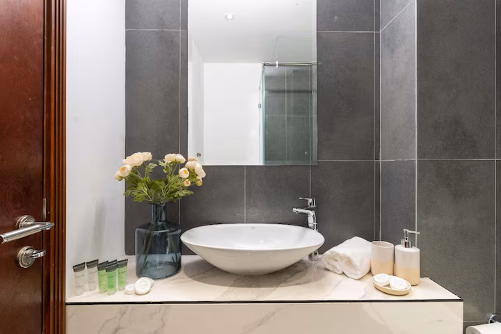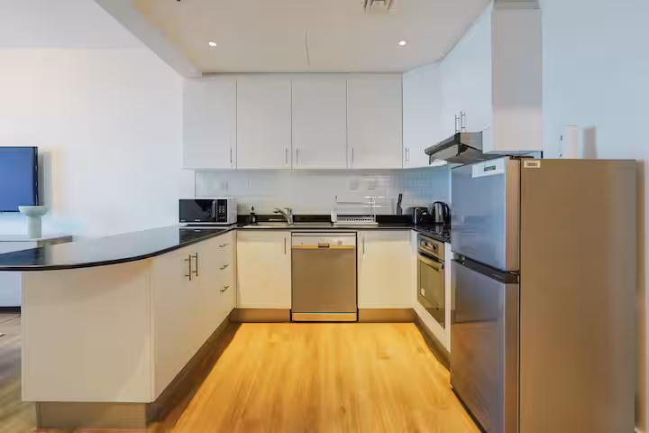 The building is nestled within the city that has a lot of restaurants and groceries around. You can also cook as the house includes a fully equipped white kitchen.