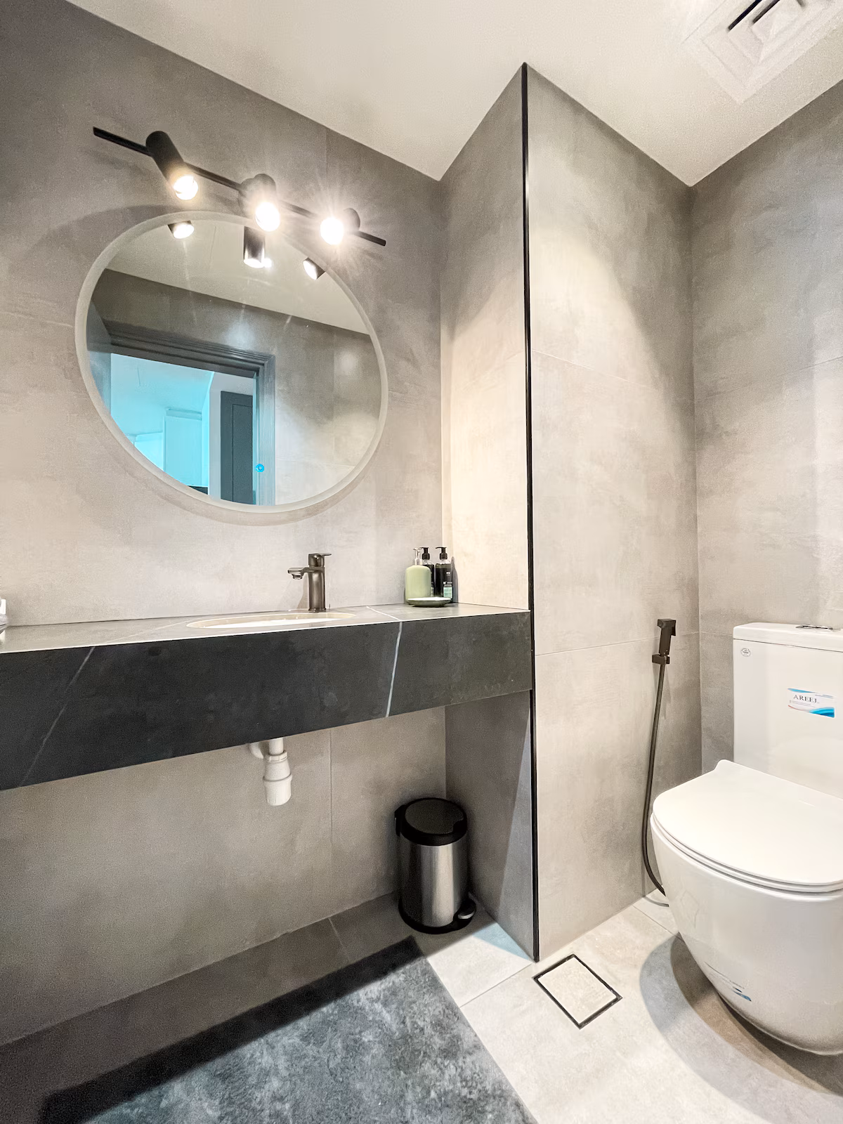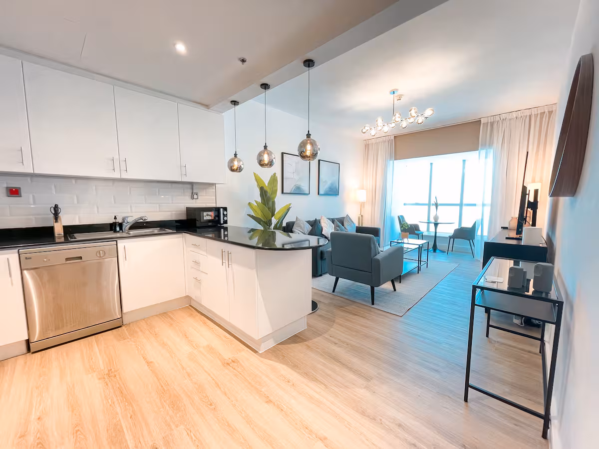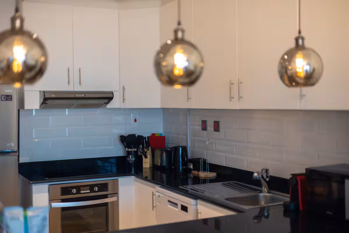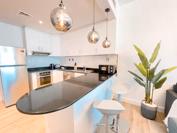 The building is nestled within the city that has a lot of restaurants and groceries around. You can also cook as the house includes a fully equipped white kitchen.
