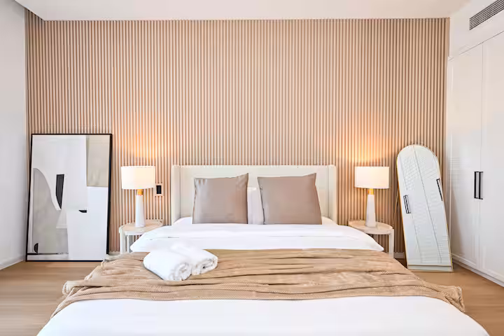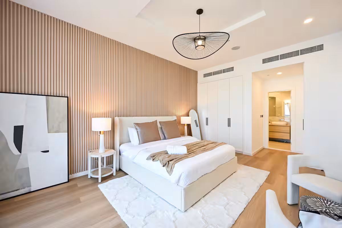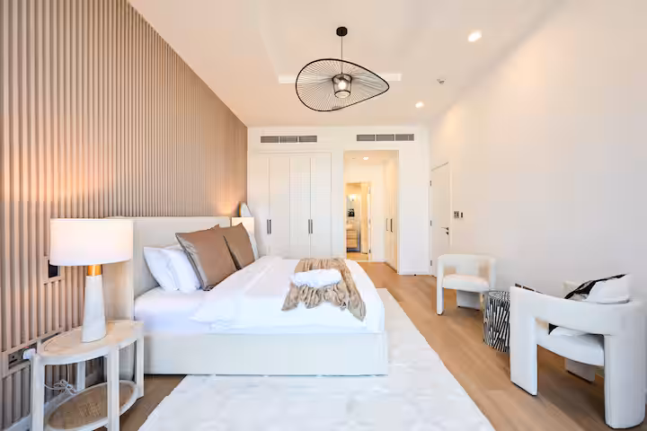 🛏️ Spacious bedroom with a plush king-size bed and ample storage