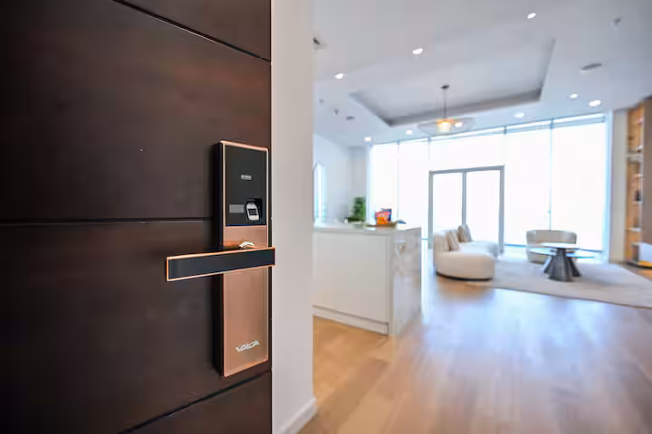 This spacious 1BR boasts a king bed, a sleek kitchen, and a private balcony.